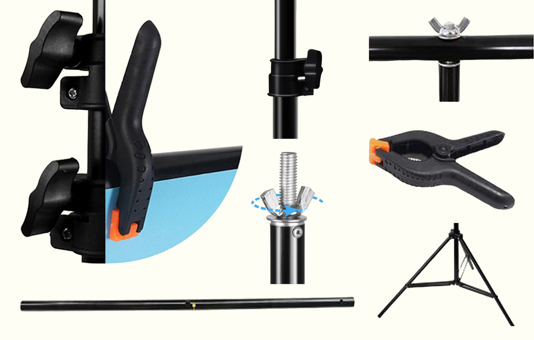 Packaging list: Crossbar, Stand, Background clips x2, Background screen x2