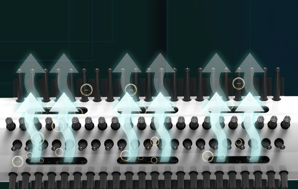 El dispositivo se distingue por su diseño cuidadosamente pensado. La punta aislada facilita el cambio de puntas y protege contra quemaduras, mientras que la abertura aerodinámica garantiza un buen flujo de aire. Además, la tecnología de iones negativos de 360° evita la electrificación del cabello y el aislamiento de goma reduce el ruido de funcionamiento del dispositivo. Además, las puntas son fáciles de instalar/quitar.