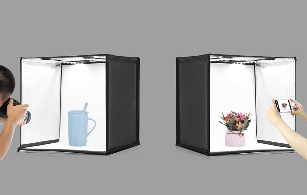 La carpa tiene una cubierta superior que se puede abrir, lo que te permite capturar fotos desde arriba. Además, el kit incluye fondos fotográficos de varios colores, lo que ofrece flexibilidad para ajustar el esquema de colores según tu producto específico con facilidad.