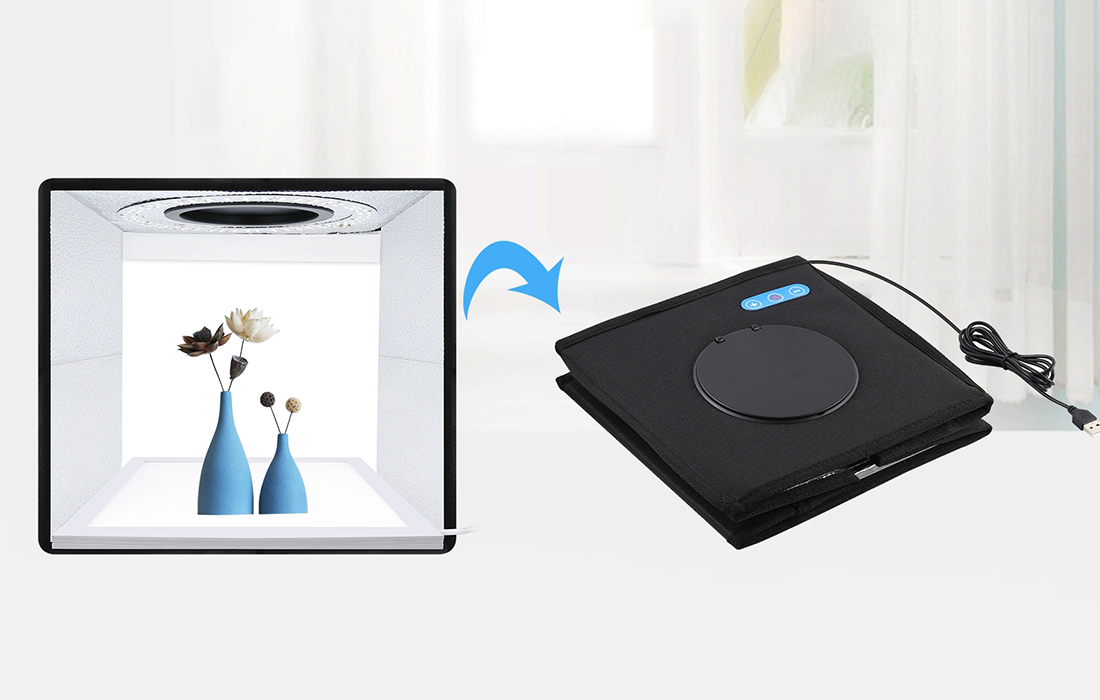 El estudio fotográfico presume de un diseño cuidadoso, con paredes internas revestidas con un material reflectante, garantizando una distribución uniforme de la luz emitida por la lámpara LED posicionada encima. Esta disposición estratégica maximiza la cobertura de luz en todo el estudio, lo que resulta en una calidad fotográfica superior con una profundidad y dimensionalidad mejoradas. Además, un agujero estratégicamente posicionado en la pared superior facilita perspectivas de fotografía de arriba hacia abajo, ofreciendo versatilidad en la captura de ángulos y composiciones únicas. Desde la iluminación completa hasta las opciones de fotografía innovadoras, cada aspecto del diseño está meticulosamente elaborado para elevar tu experiencia fotográfica y producir resultados excepcionales.